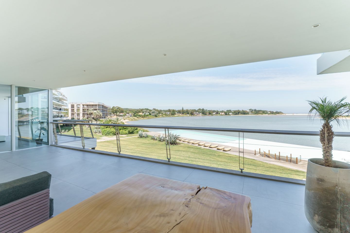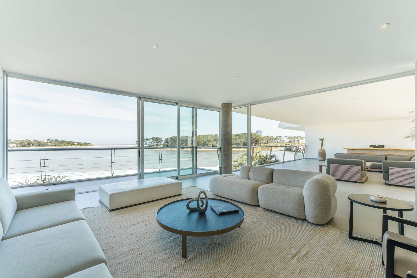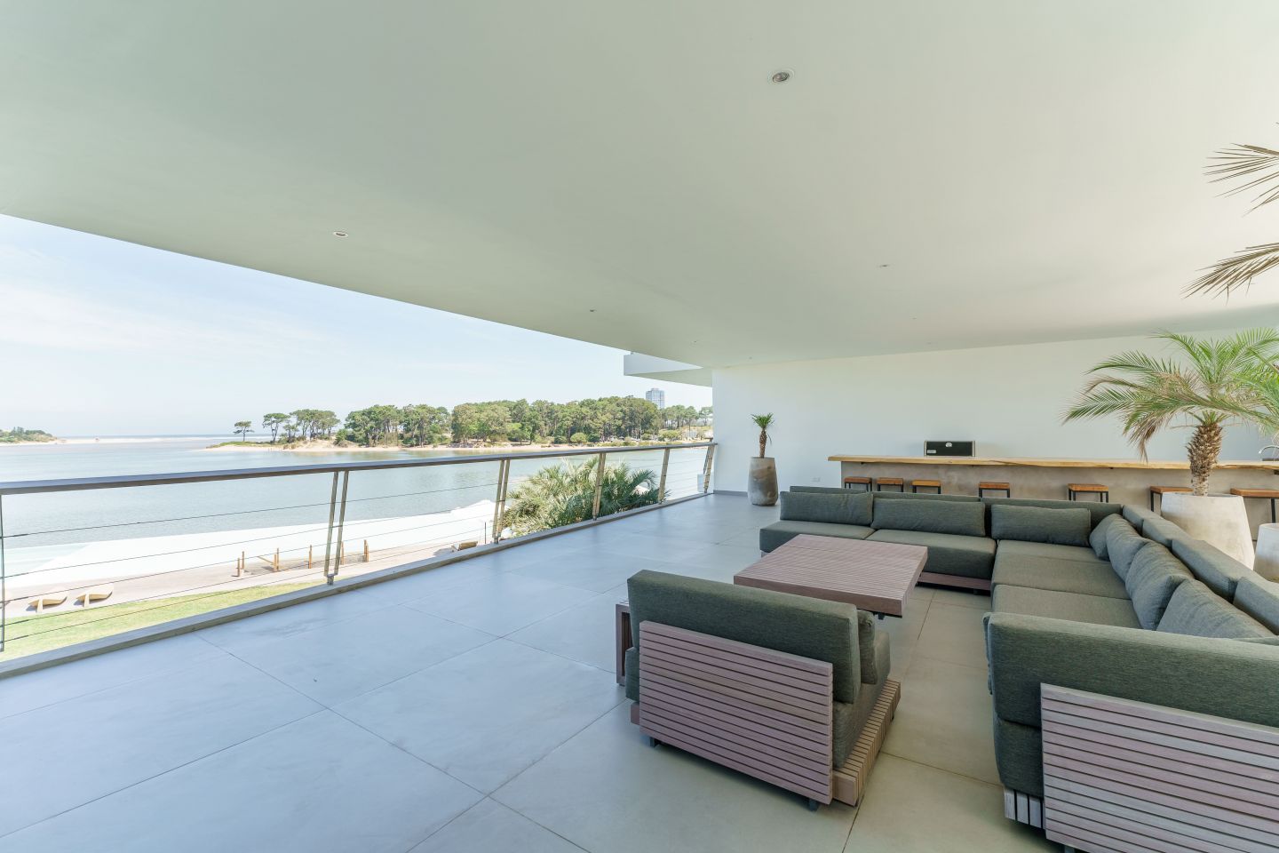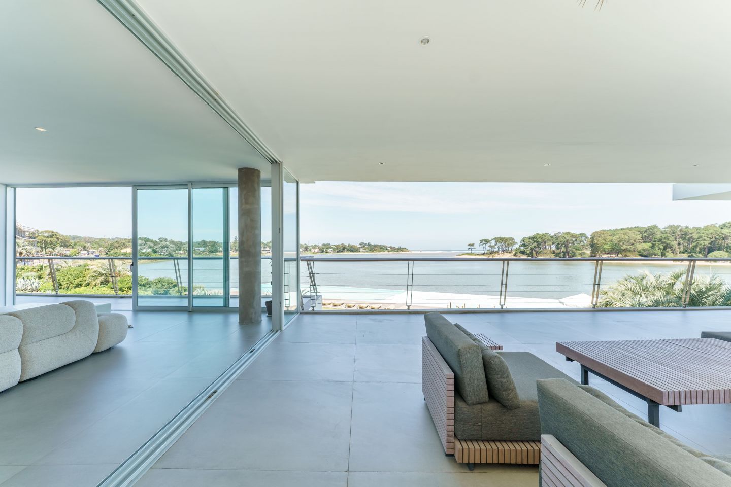 Excelente Departamento en edificio moderno con completos servicios frente a laguna de La Barra. Cuenta con amplio living comedor con hermosa vista a la laguna, salida a amplia terraza lateral con Parrillero, 3 dormitorios en suite ( principal al frente con vista a laguna), toilette, cocina con isla totalmente equipada con electrodomesticos Panelables Beko (Horno, Campana, Anafe, Heladera, Frezzer, Lavavajillas), Gran Estar con Tv Room y dependencia de servicio con baño.  4 garages. Totalmente equipado y decorado. Aire Acondicionado Central y Losa Radiante.